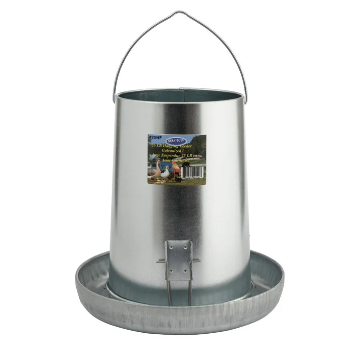 25 lb capacity metal hanging feeder, 3 adjustable metal clips used to attach bottom to tube, also allows for 5 different flow rates.